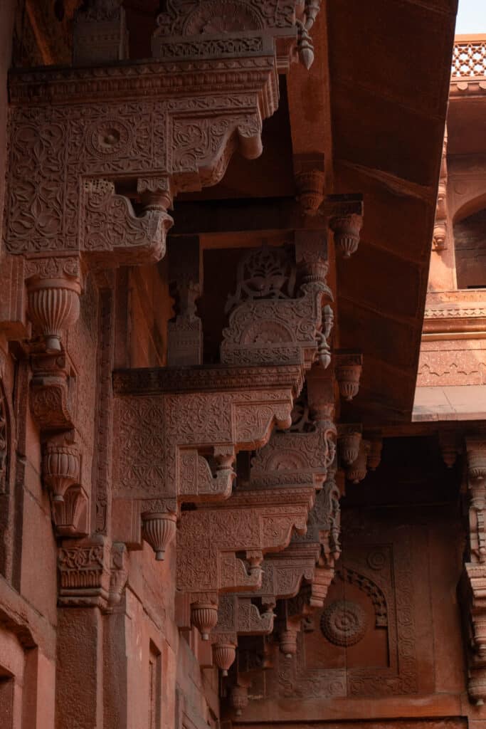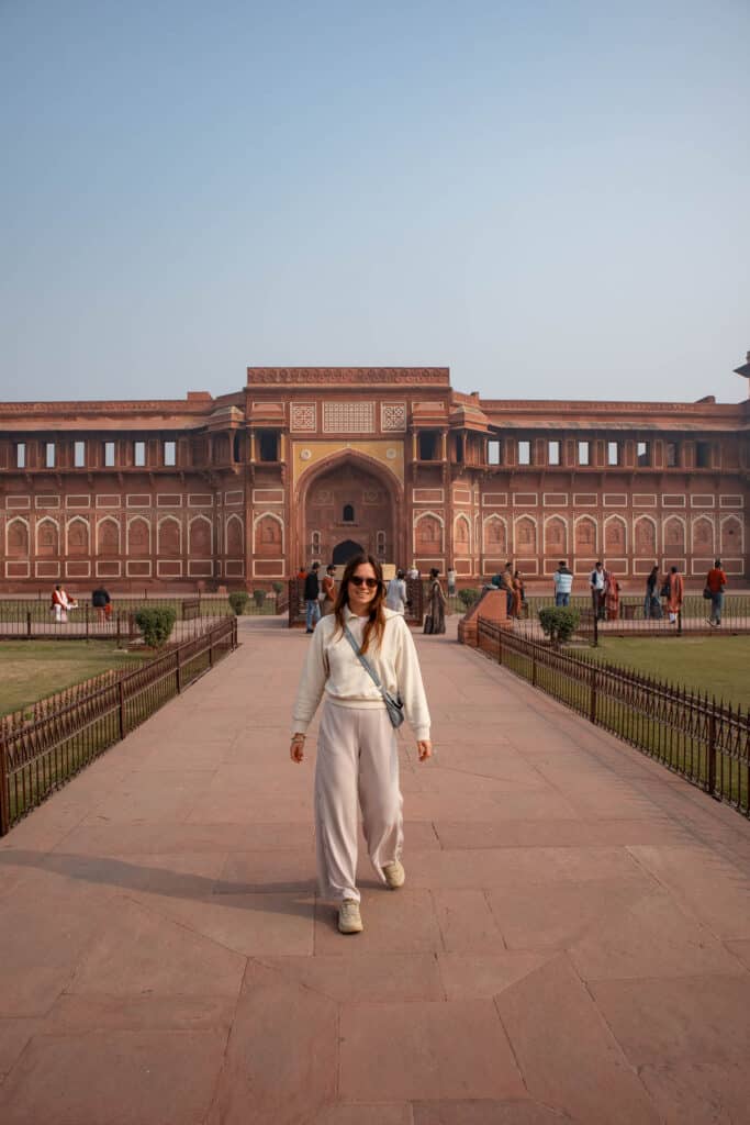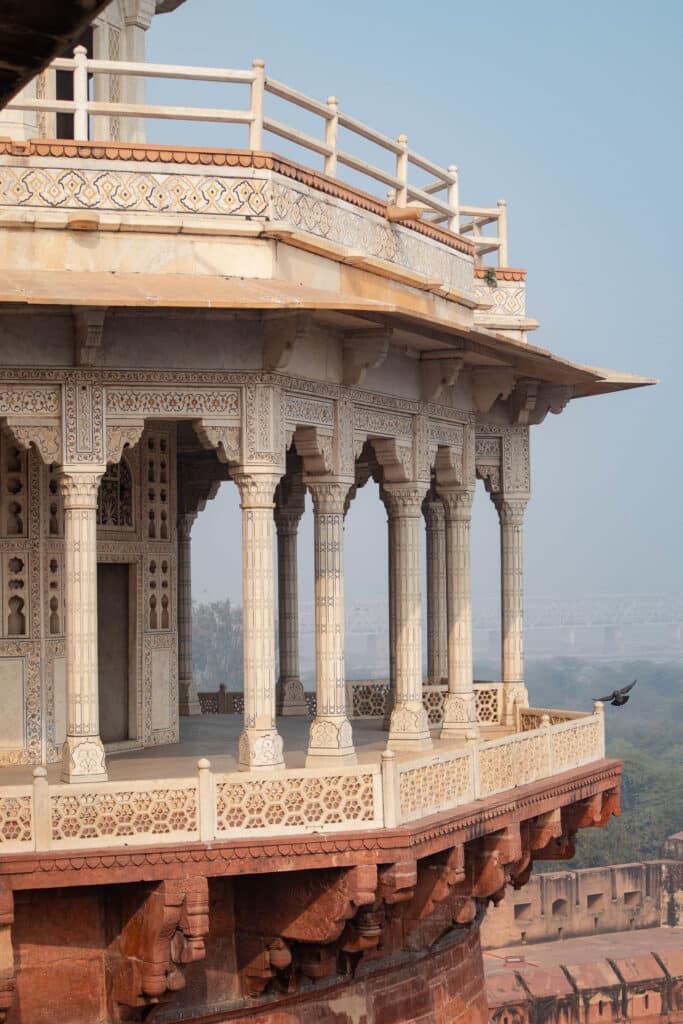 • Visite du Fort d’Agra : L’après-midi, on a visité cette immense forteresse en grès rouge classée à l’UNESCO, située à 2,5 km du Taj. C’est ici que Shah Jahan (celui qui a construit le Taj Mahal) a fini sa vie, emprisonné par son propre fils. D’ordinaire, on a une vue imprenable sur le Taj depuis les fenêtres des palais, mais avec la brume, on a dû l’imaginer !