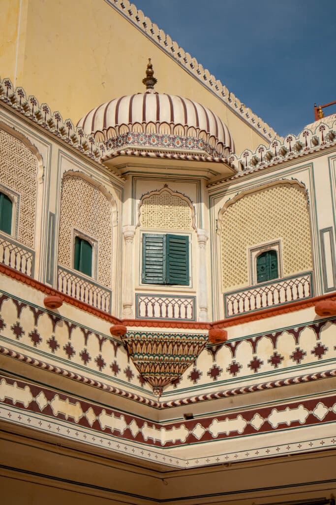 • Le City Palace : C’est le cœur névralgique de Jaipur. Une partie du palais est encore habitée par la famille royale actuelle ! Le complexe est un enchaînement de cours, de jardins et expositions au style mélangeant influences rajasthanes et mogholes. C’est calme et ça fait du bien !